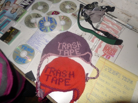 i made these hats for my awesome friends at trash tape records. i knit the hat with this free pattern, added a duplicate stitch for the lettering, and crocheted the border with braided tassels